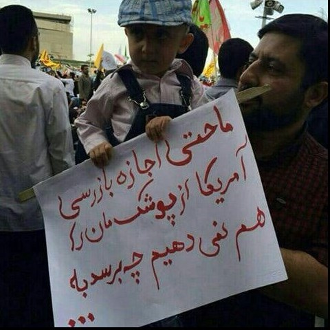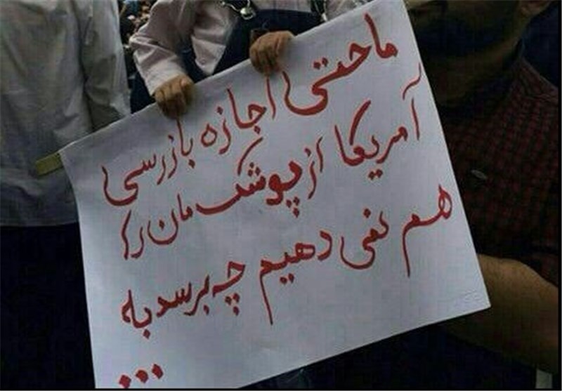 خبرگزاری تسنیم: در تجمع امروز مردم مشهد علیه زیاده‌خواهی‌های طرف مقابل در مذاکرات هسته‌ای برای بازرسی از اماکن نظامی کشورمان، پلاکاردهای جالبی توسط برخی شرکت‌کنندگان حمل می‌شد.