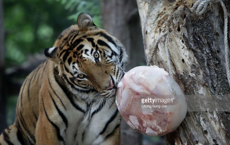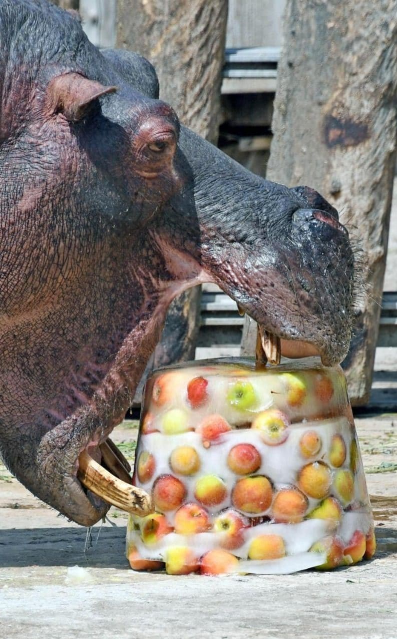 به گزارش خبرنگار اجتماعی خبرگزاری تسنیم، با فرارسیدن فصل گرما حیوانات باغ وحش شهر کارلسروهه آلمان وعده غذایی ناهاری می‌خورند که معروف به «بمب یخی» (ice bomb) است.