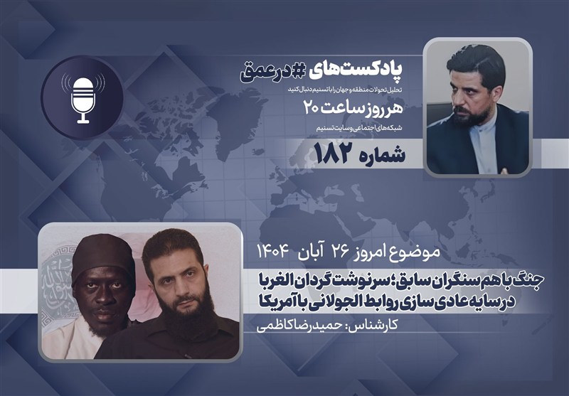 گروه بینالملل خبرگزاری تسنیم ـ یکصدوهشتادودومین شماره از پادکست «در عمق» که به بررسی مهمترین روندها، تحولات و همچنین شخصیتها در غرب آسیا میپردازد، روز دوشنبه 26 آبان 1404 ضبط و منتشر شد. «حمیدرضا کاظمی»، کارشناس مسائل خاورمیانه و خلیج فارس، در این اپیزود درگیریهای داخلی در میان شبهنظامیان سلفی در سوریه را از نظر میگذراند.