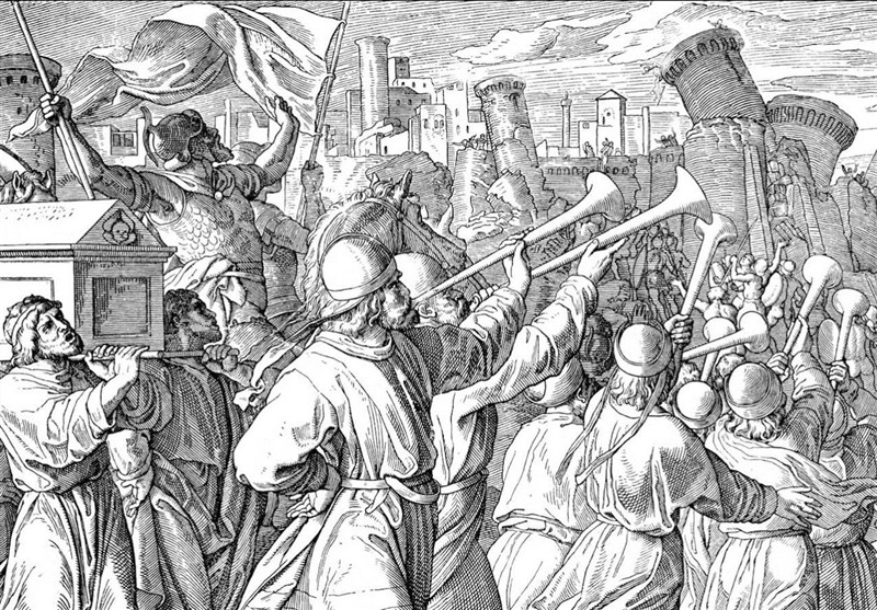 تصویر خبر، یکی دیگر از تصاویر قدیمی موجود در نسخ خطی یهود درباره تصاحب و اشغال فلسطین توسط یهودیان است. برج و باروهای «اریحا» اولین شهر در کنعان بعد از رود اردن است. کتاب یوشع، فصل 6 روایت میکند که بنیاسرائیل بهفرمان خدا، هفت روز دور شهر اریحا چرخیدند و در روز هفتم با دمیدن در شاخهای قوچ و فریاد مردم، دیوارهای شهر فرو ریخت. آنچیزی که روی دوش یهودیان است بهنظر میرسد که تابوت عهد باشد. تابوت عهد (Ark of the Covenant) صندوقی مقدس در سنت یهود و مسیحیت است که طبق روایت تورات، لوحهای ده فرمان، عصای هارون و کوزهای از مَنّا در آن نگهداری میشد. این تابوت نماد حضور خدا میان بنیاسرائیل بود و جایگاه ویژهای در تاریخ و آیین آنان دارد.